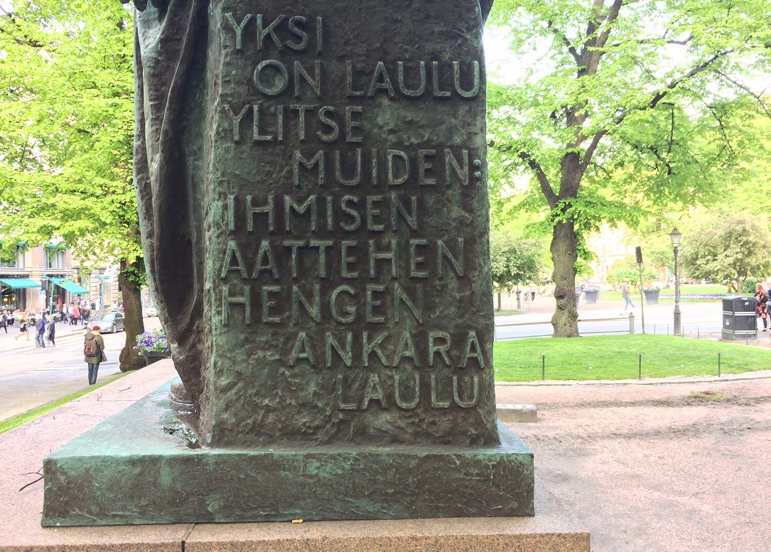 Leinon teksti (kuvassa) on katkelma runosta Väinämöisen laulu. Teksti löytyy hänen muistopatsaansa juurelta.